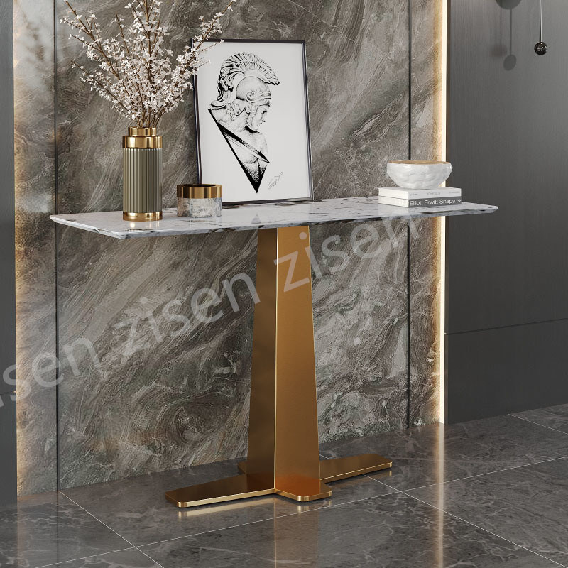1.Ceramic Marble Tabletop: Meja konsol memiliki meja keramik berkualitas tinggi yang menambahkan sentuhan kemewahan dan kehalusan.memamerkan pembuluh darah alami dan variasi warna yang membuat setiap potongan unikDaya tahan keramik memastikan bahwa meja akan tahan penggunaan sehari-hari sambil mempertahankan keindahannya.